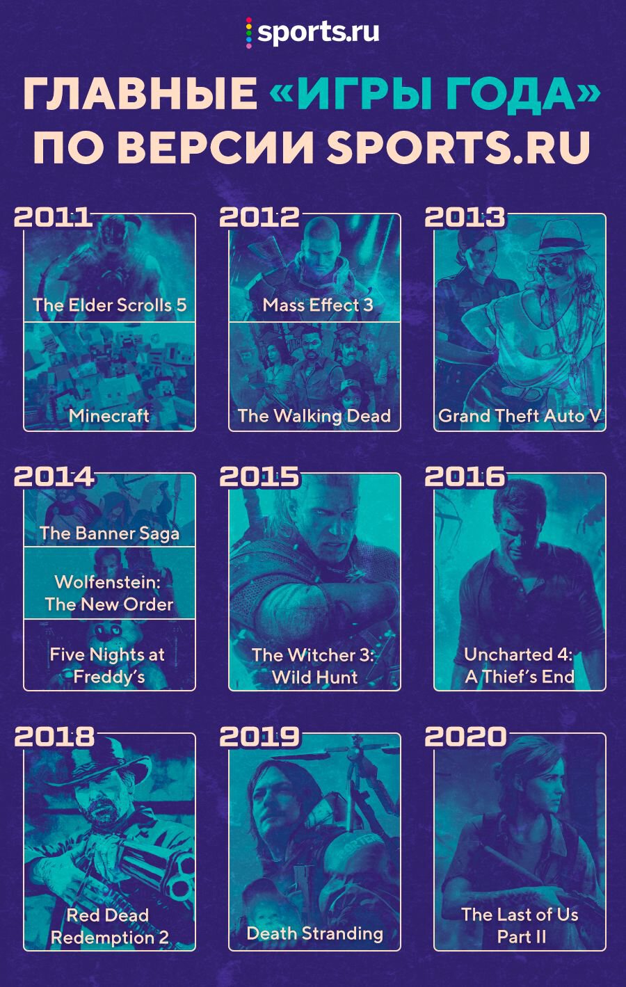 Так мы выяснили, что в редакции больше всего любят «Ведьмака 3» (за него аж 6 голосов) – впрочем, едва ли кто-то удивлен. За ним следуют высокооцененные Red Dead Redemption 2 и The Last of Us Part II (по 5 голосов), а также нашумевшая Death Stranding Хидэо Кодзимы и GTA 5 (по 4 голоса).