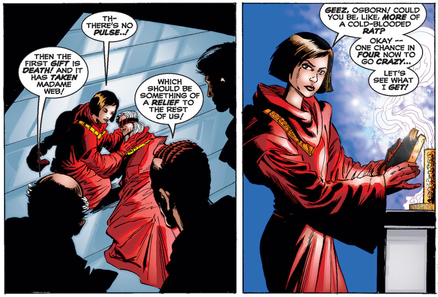 Мэтти Франклин (которую играет Селеста О’Коннор в фильме Мадам Паутина) имеет, пожалуй, самое дикое происхождение из трех женщин, представленных здесь, беря свое начало в одном из последних в очень длинном списке ужасных решений, принятых Marvel в Комиксы 90-х годов о Человеке-Пауке. В кульминационной истории, предшествующей мягкой перезагрузке, Норман Озборн, Зеленый Гоблин, проводит запутанный оккультный ритуал, который должен был дать ему силы Человека-Паука. Вместо этого Мэтти получает их, как читатели узнали в большом повороте, где Питер Паркер показан не Человеком-Пауком в большом перезапуске его комикса 1999 года.