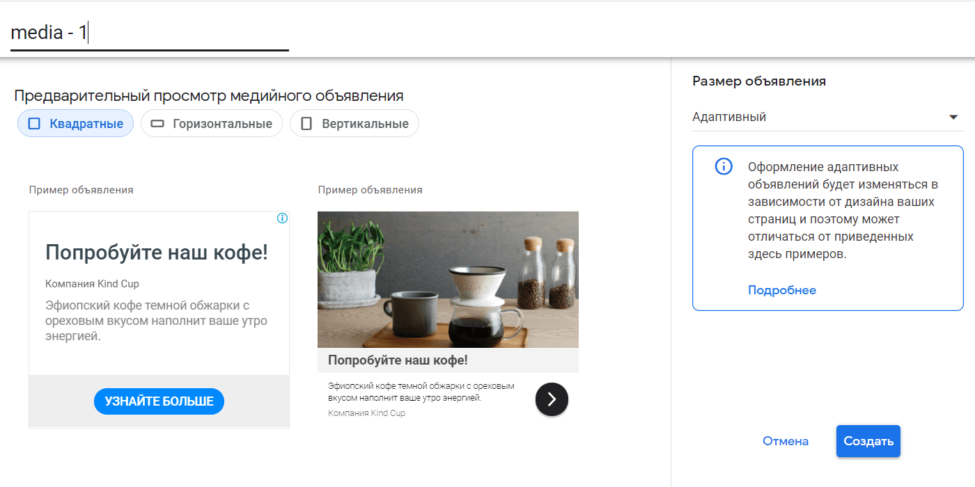 Создайте медийный рекламный блок в аккаунте AdSense, выбрав в разделе «Размер объявления» вариант Адаптивный. Сохраните из кода объявления следующую информацию: