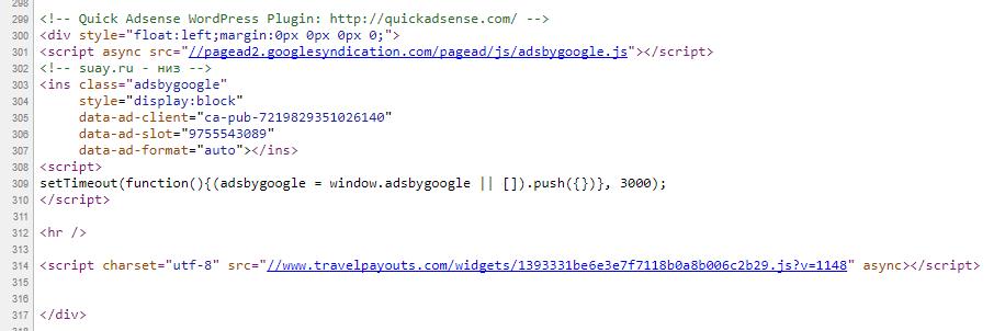 Теперь заменим синхронный код рекламного блока Google Adsense на асинхронный. Сейчас он выглядит у нас как-то вот так, и тормозит загрузку страницы: