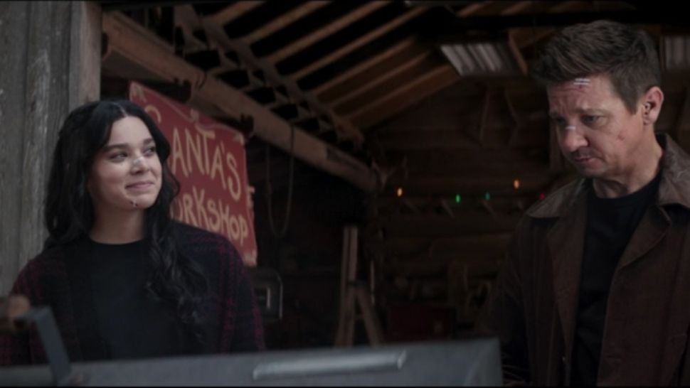 Джереми Реннер в роли Клинта Бартона (Соколиный глаз) и Хейли Стайнфелд в роли Кейт Бишоп.