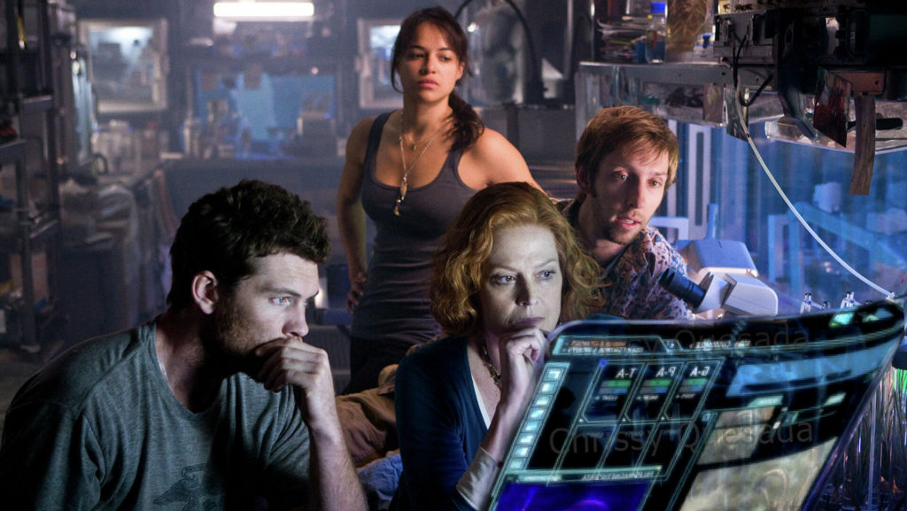 Грейс Августин (Сигурни Уивер), Джейк Салли (Сэм Уортингтон), Труди (Мишель Родригес) и Норм Спеллман (Джоэль Дэвид Мур) – команда ученых. Кадр из фильма.