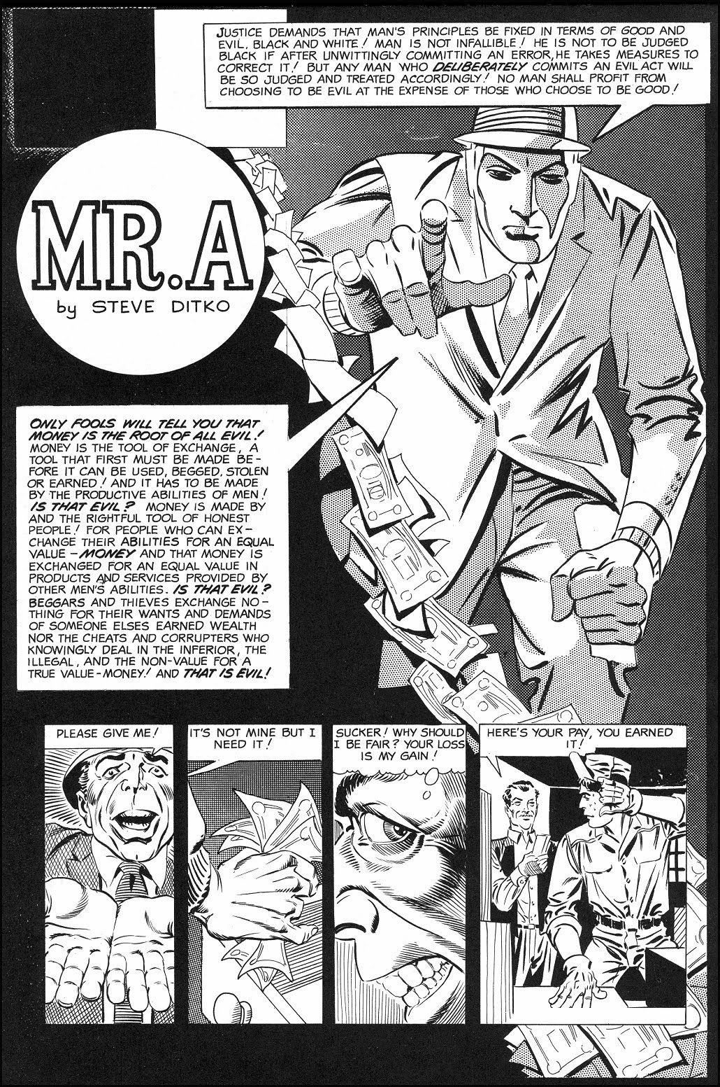В конце 60-х Стив Дитко увлекся произведениями американской писательницы Айн Рэнд. Он разделял ее философию объективизма, которую она пропагандировала в своих книгах. Ее взгляды и послужили основой для авторского супергероя Дитко — Мистера А (Mr. A). Его историю и образ он придумал и нарисовал самостоятельно.