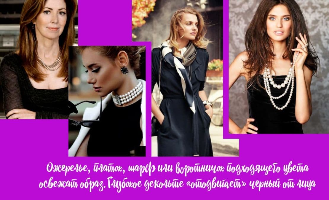 Если вы надеваете черное платье или топ, есть маленький трюк: ожерелье, платок, шарф или воротничок подходящего цвета освежат образ. Также работает и глубокое декольте, «отодвигая» черный от лица.