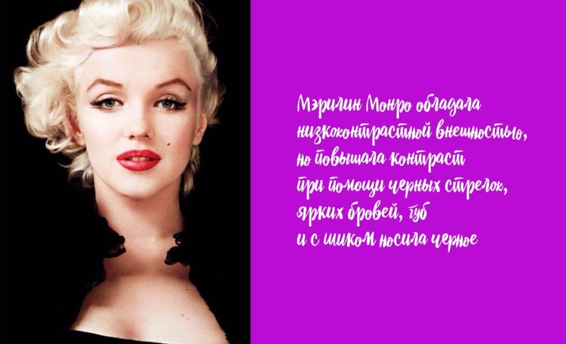 Например, Мэрилин Монро обладала низкоконтрастной внешностью, но повышала контраст при помощи черных стрелок, ярких бровей, губ и с шиком носила черное.
