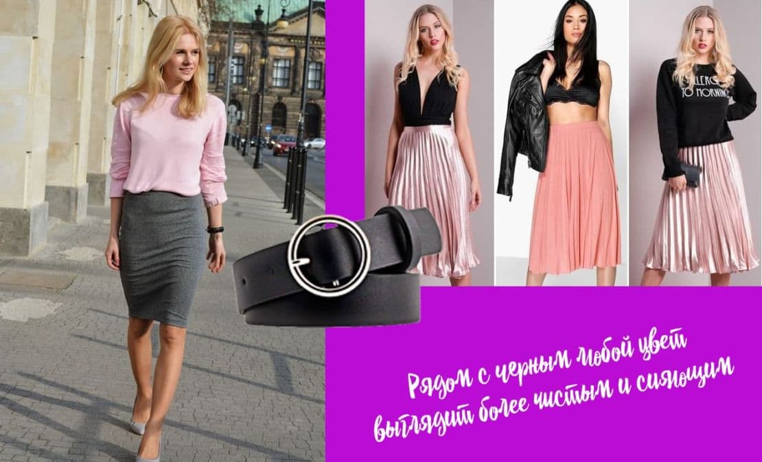 Пользуйтесь свойством черного освежать другие цвета. К примеру, блузка пыльно-розового цвета с серой юбкой выглядит невзрачно, но стоит надеть черный ремень или пояс, и розовый засияет.