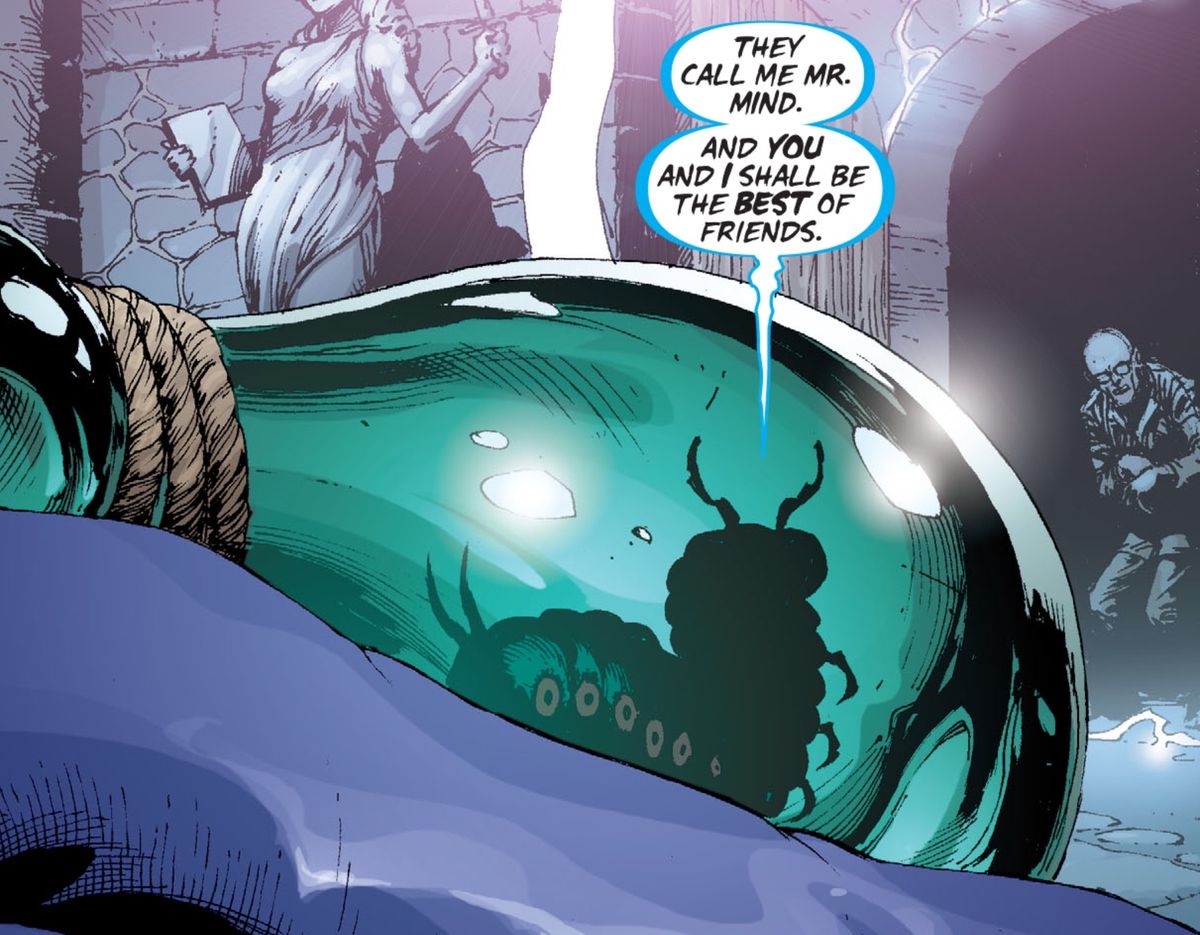 In 1974, Mister Mind was first seen looking at a young Thaddeus Sivana from his terrarium. After an older Thaddeus Sivana frees the Seven Deadly Enemies of Man and attacks the wizard, Mister Mind’s terrarium breaks and he was able to escape.
