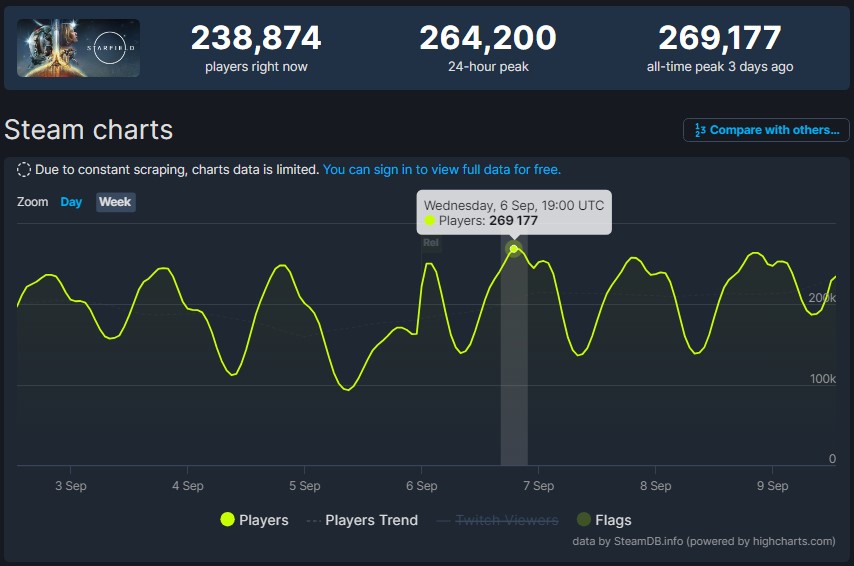 На этой неделе состоялся полноценный релиз Starfield. Общий онлайн в Steam у игры подрос, но сильно превысить показатели раннего доступа не получилось — 248 тысяч против 269 тысяч после релиза. Видимо, на это повлиял Game Pass, где игра доступна, в том числе на ПК. На следующий день после релиза Bethesda заявила, что в Starfield сыграло более 6 миллионов игроков, только без какой-то конкретной информации о платформах или количестве проданных копий.