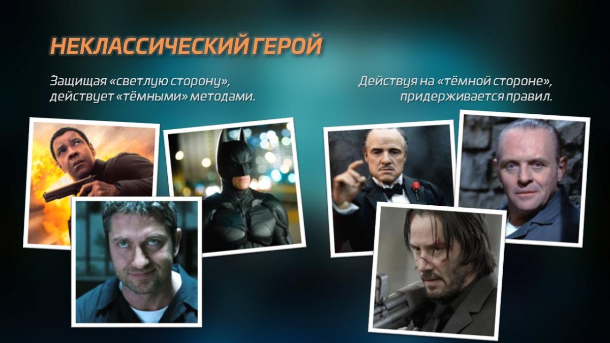 Неклассический герой может быть и представителем «темной стороны». Он будет преследовать личные интересы, но при этом будет уважать правила той группы, к которой он принадлежит. К таким героям относятся персонажи типа дона Корлеоне и Джон Уик первой части. Наверняка Джон Уик заработал себе уважение не только мастерством киллера, но и своим благородством, следованием законам чести.