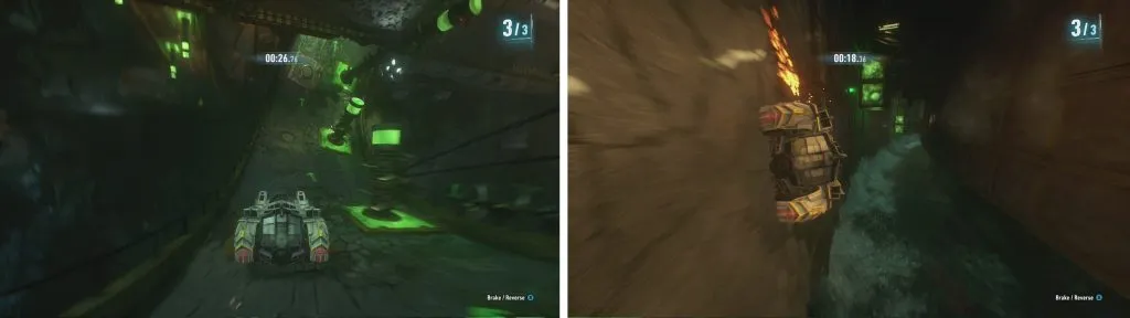 По мере прохождения трассы вам нужно будет использовать код доступа Загадочника, который мы получили ранее, чтобы добавлять / удалять / перемещать препятствия, пандусы и платформы на гоночной трассе и за ее пределами. На этой трассе есть комбинация объектов из первых двух гонок, которыми мы можем управлять, и они включают стены, дверные проемы / ворота и разрушающиеся полы. У нас также будет доступ к активации / деактивации определенных ловушек с вращающимися шипами.