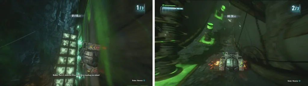 В этой области поверните за угол и активируйте нажимную пластину, чтобы в последний раз понизить уровень воды. Перед выходом переключитесь на дистанционное управление бэтмобилем и используйте его, чтобы стрелять в сторожевые башни, которые появились в коридоре позади вас.