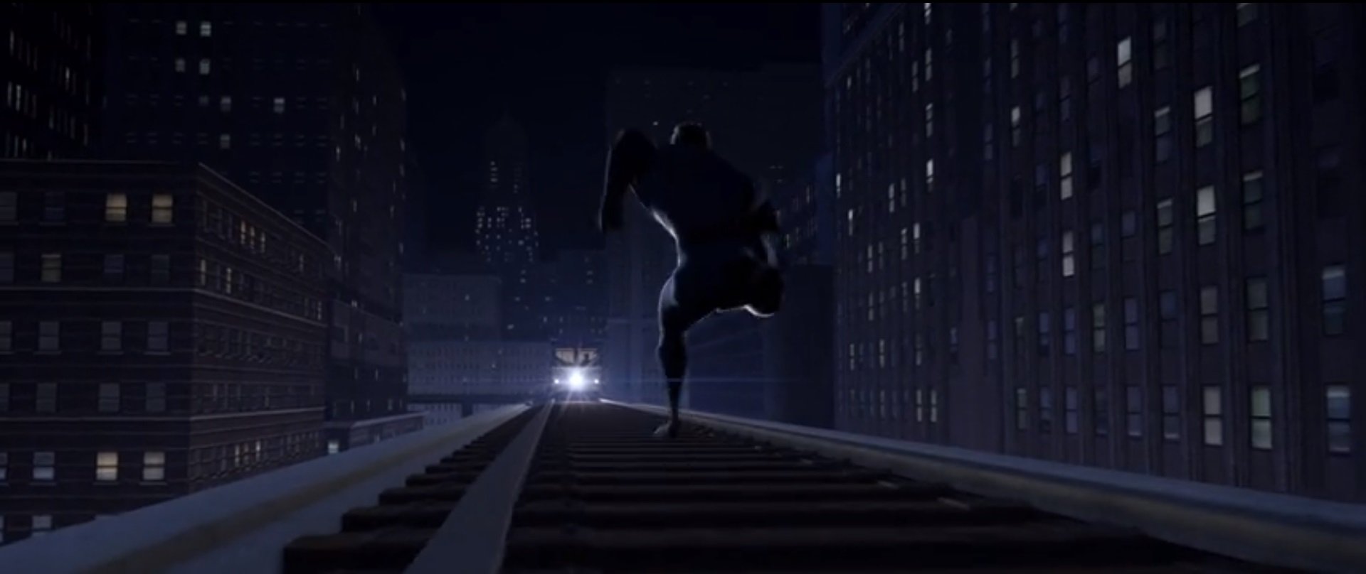 Второе, что может быть не так заметно, но не менее круто — это работа с перспективой. Игра с перспективой зачастую отлично подходит для экшн-сцен. Как, например, тут, в первой части «Суперсемейки».