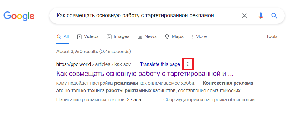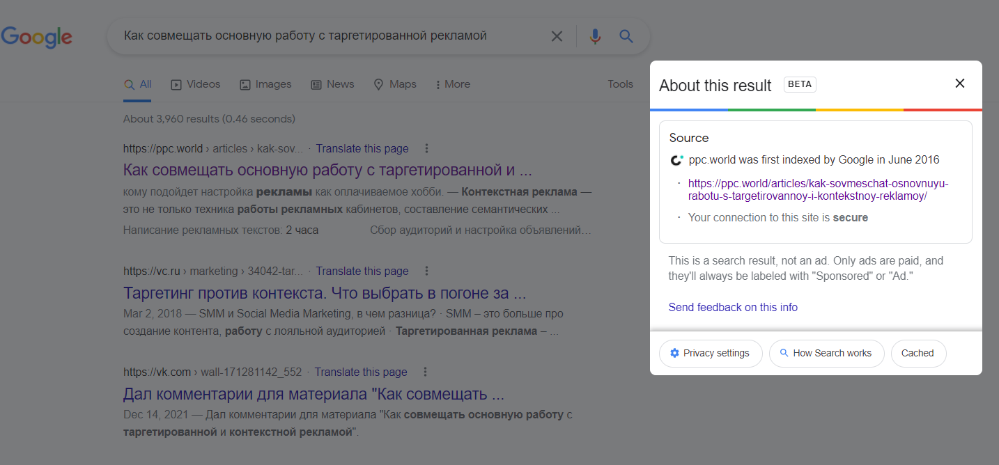Например, я ищу информацию о том, как совмещать основную работу с таргетированной рекламой. Первая ссылка, которую выдает поисковик — статья ppc.world. Допустим, я не знаю, что это за источник, и хочу чекнуть информацию о нем. Для этого нажимаю на три точки справа от URL сайта — этот клик откроет вкладку «Об этом результате» (About This Result).