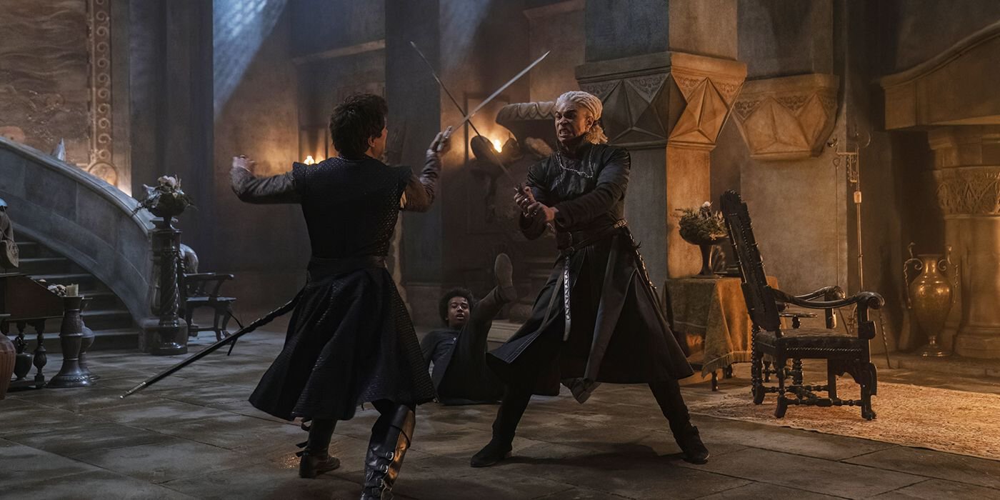 До сих пор в других рекламных материалах был показан кадр, в котором Алисент бросается вперед с кинжалом, а в трейлере было показано, на кого она бросается — на Рейниру. Кажется, это действительно важный момент, когда два друга стали заклятыми врагами, что привело ко всему конфликту. В частности, это, вероятно, приведет к тому, что их сыновья будут драться и оставят Эймонда — второго старшего сына Алисент — с одним глазом.