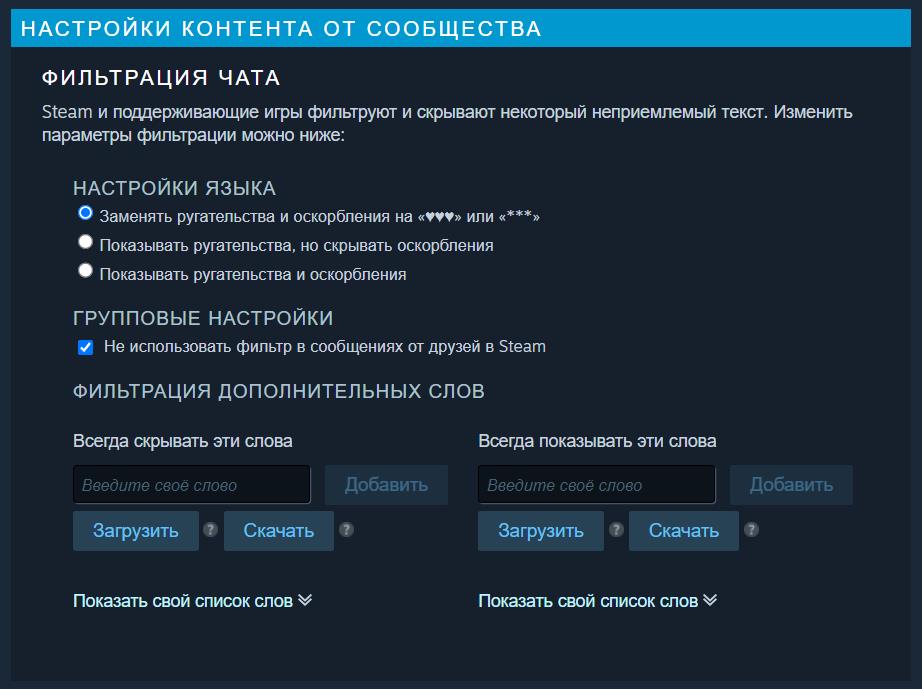 Если вы хотите видеть все нецензурные выражения и ругательства за исключением отдельных слов, то Steam позволяет это сделать. Фильтр можно настроить таким образом, чтобы он пропускал абсолютно все неприличные фразы, кроме тех, которые вы укажите