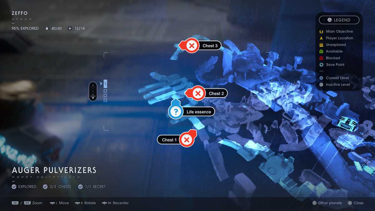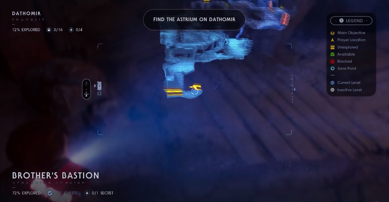 Вы можете во всех подробностях рассмотреть нужные вам участки локации, разметить для себя маршруты, посмотреть, что вам удалось найти и так далее. Играли в Doom 2016 или Doom Eternal? Вот, примерно такая карта. Также важно помнить следующее: зеленый цвет — можно пройти, желтый цвет — вы там еще не были, красный цвет — проход недоступен. Карта в Star Wars Jedi: Fallen Order крайне интуитивна и она вам определенно понадобится.