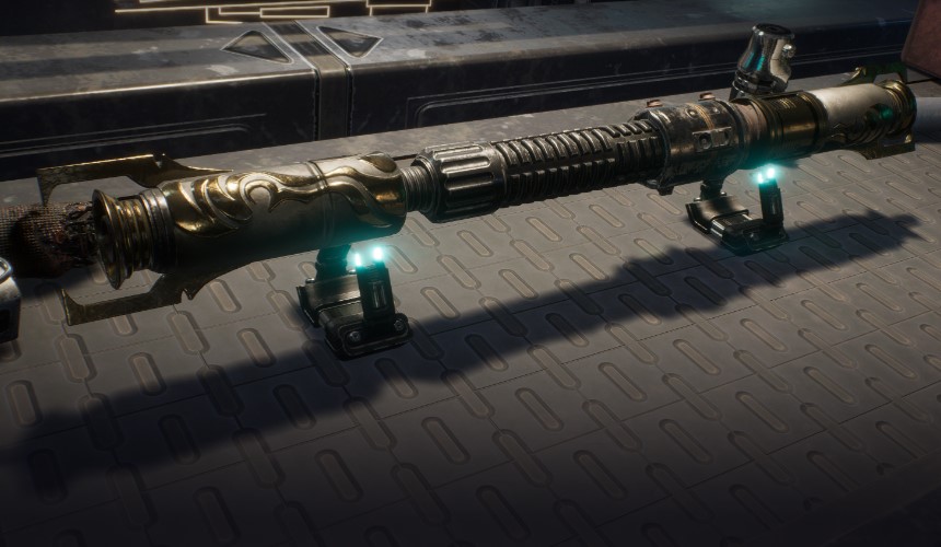 The regular way to get the double-bladed lightsaber is during a mission on Kashyyyk. You’ll find it while climbing the Origin Tree, right after you ride the dopey giant bird and arrive at Chieftain’s Canopy. Interact with the workbench found right after the flight, and Cal will repair his rusty old saber, making it double-bladed.
