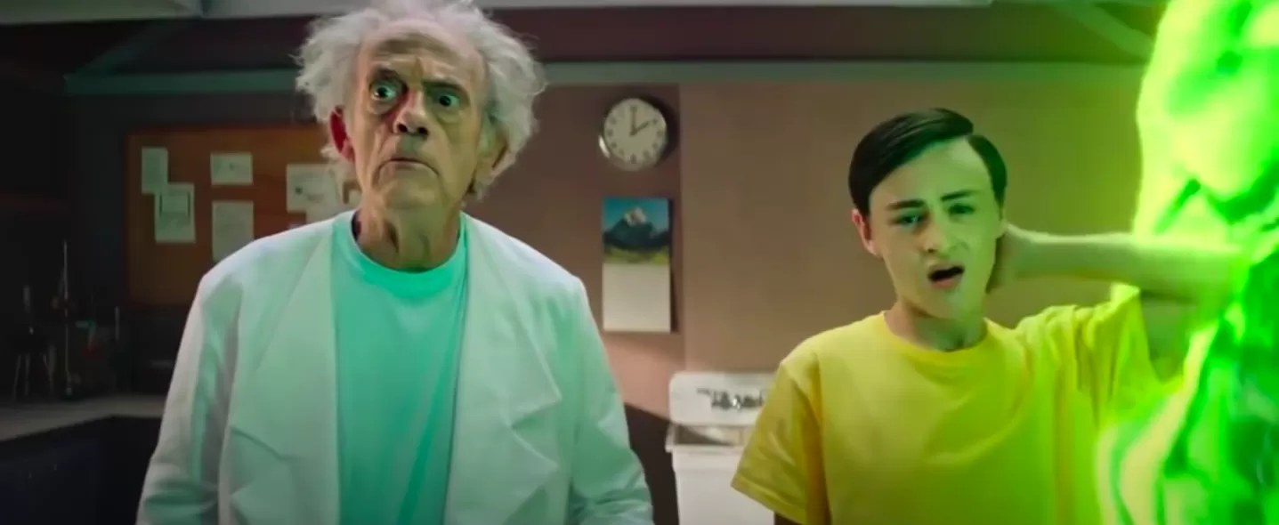 СКРИНШОТ ИЗ КОРОТКОМЕТРАЖКИ «РИК И МОРТИ В РЕАЛЬНОЙ ЖИЗНИ», ВЫПУЩЕННОЙ ADULT SWIM ПЕРЕД ВЫХОДОМ ПЯТОГО СЕЗОНА СЕРИАЛА. В ФИЛЬМЕ СЫГРАЛ КРИСТОФЕР ЛЛОЙД, ИЗВЕСТНЫЙ ПО РОЛИ ДОКА В «НАЗАД БУДУЩЕЕ». ЭТОТ ГЕРОЙ СТАЛ ПРООБРАЗОМ РИКА