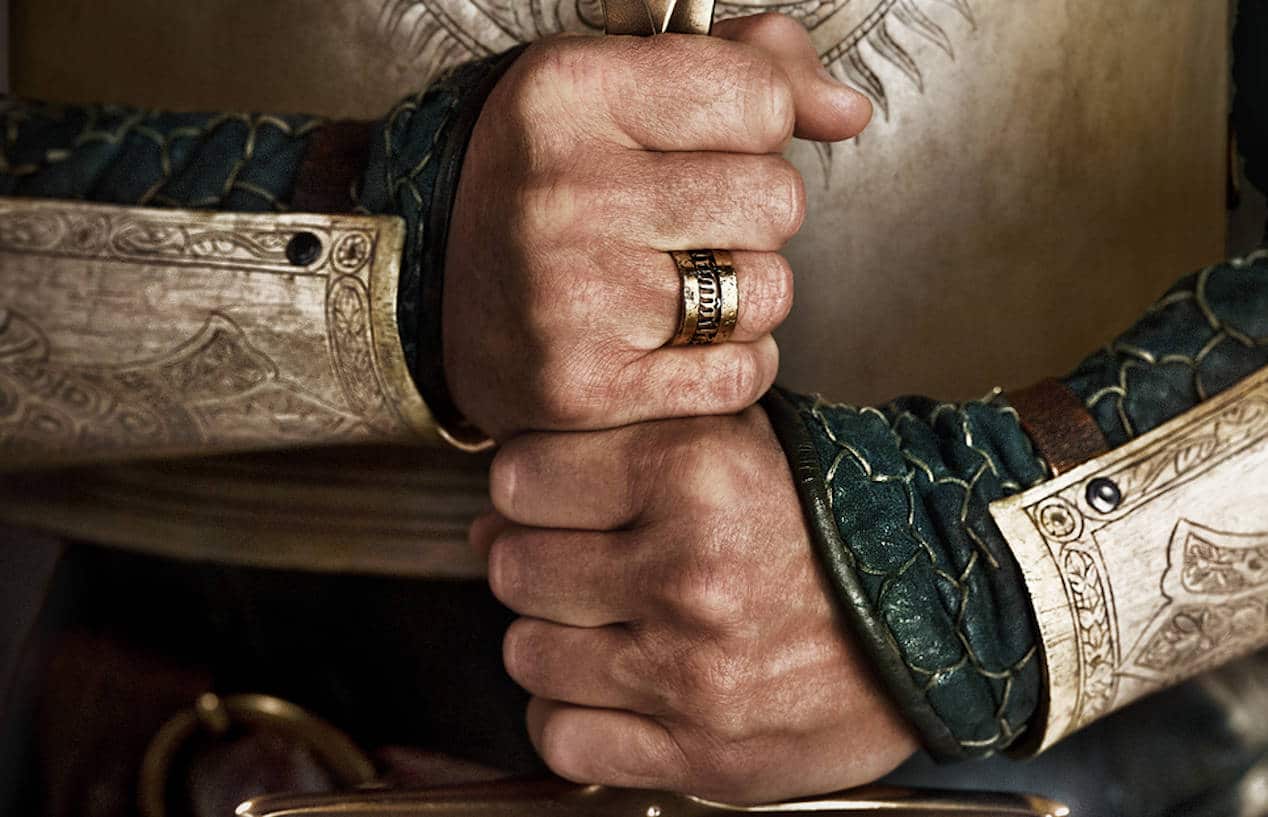 Еще одно кольцо на руке, держащей меч, на рукоятке которого вырезана башня и, возможно, человеческий король. Некоторые думают, что это Элендил, который выходит в начале фильма Братство Кольца, в войне против Саурона.