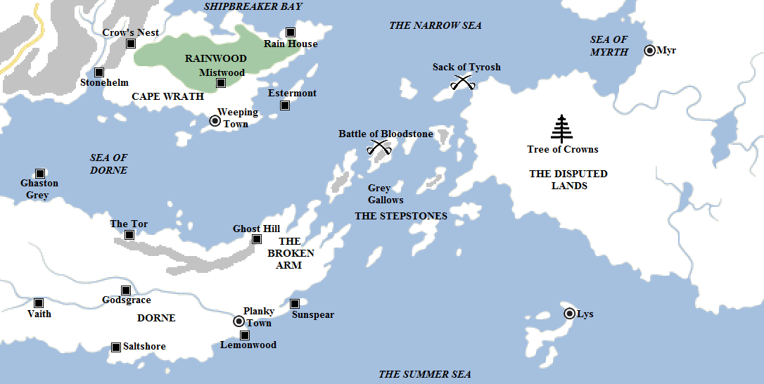 Лорд Корлис Веларион сообщает, что «растущий союз свободных городов начал называть себя «Триархией». Они собрались на Кровавом камне и в настоящее время очищают Ступени от пиратского нашествия.