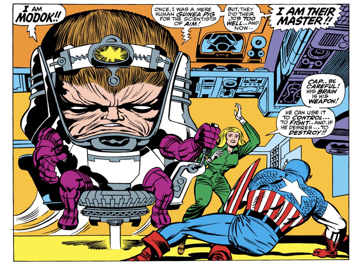 Он манипулировал своими товарищами по команде и изменил свое кодовое имя на МОДОК (Ментальный организм, созданный только для убийства), потому что он любил убивать. В своем первом появлении он столкнулся с Капитаном Америкой . Затем он сразился с Доктором Дума и, наконец, с Нэмором, который сокрушил его. В течение его карьеры МОДОК и его агенты AIM часто выступали против Мстителей .