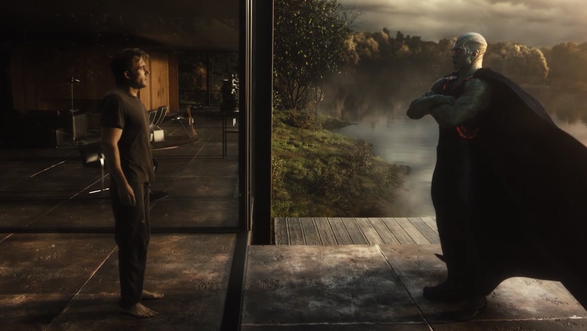 Сцена завершается тем, что Бэтмен просыпается в своем загородном доме. Брюс Уэйн выходит на террасу, где встречается с тем, о ком мы уже знали. Конечно, в финале появляется инопланетянин, «у которого много имен». Брюсу незнакомец говорит, что тот может звать его Марсианский охотник.