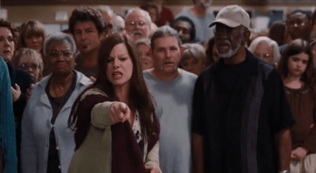 Поведение миссис Кармоди имеет мало общего с религией и религиозностью – скорее, это апофеоз того самого ужаса, который происходит изнутри самих людей. Нам, сидящим по другую сторону экрана, ее фанатичная болтовня кажется полным бредом. Мы понимаем, что это просто сумасбродство ненормальной женщины, помешавшейся на религии и почему-то возомнившей себя мессией. Но там, внутри этого супермаркета и этого мира, далеко не все разделяют нашу точку зрения. Кто-то действительно верит, кто-то боится, кого-то развлекает идея приносить в жертву других людей или, напротив, пугает вероятность того, что при непослушании большинство принесет в жертву их самих. Как бы то ни было, число сторонников миссис Кармоди неуклонно возрастает по мере того, как количество адекватных людей стремительно уменьшается.
