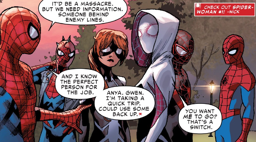 La Spider-Woman de Gwen Stacy doit toujours faire face à des ennemis, comme l’avocat corrompu et chef de la Main, Matt Murdock, dont le client gangster, le Kingpin, dirige les choses depuis la prison. La tentative de Kingpin de tuer le capitaine Stacy est ce qui pousse Gwen à parler à son père de sa double vie.