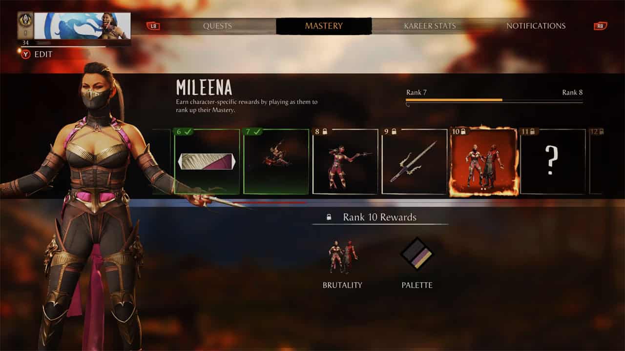 You can check when you’ll unlock a Brutality – at least for the first ten levels – by heading to the Mastery page. From the main menu, hit the View button (or Touchpad on PS5) to open your profile, then use the shoulder buttons to get to the Mastery tab. Here you can see a list of unlockables for each character. However, it’ll only show you the first ten ranks. Any rewards further than that are hidden until you reach those mastery ranks.