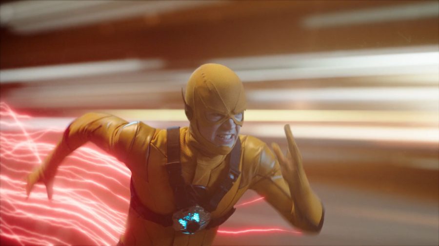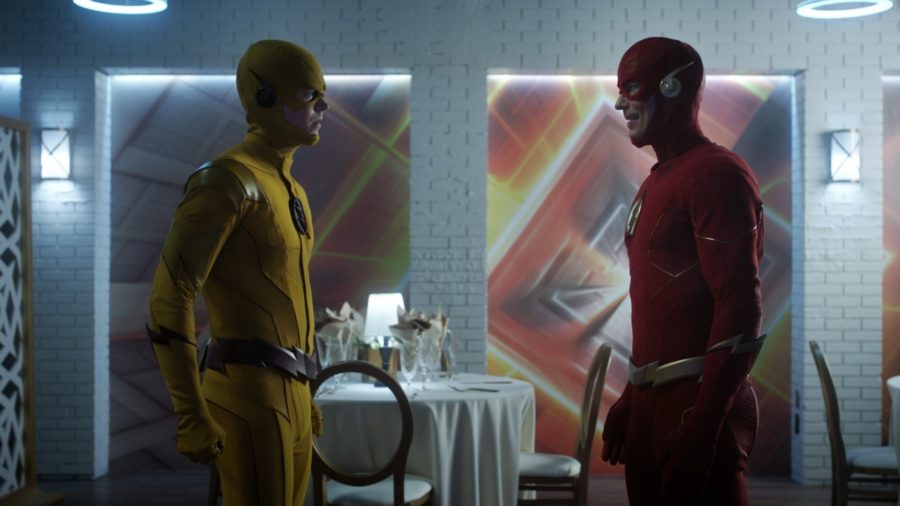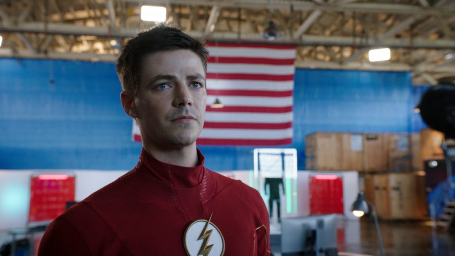 Грант Гастин в роли «Барри» Аллена (Флэша) и Томас Кавана в роли Харрисона Уэллса в 8-ом сезоне сериала «Флэш»