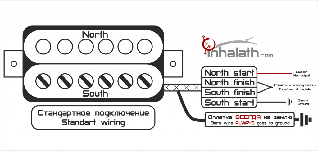 Но хамбакер — штука все-таки довольно простая по конструкции, и, несмотря на разные маркировки, провода на всех датчиках будут идти от концов катушек. (Исключение составляет активная электроника, где еще один провод идет от преампа к батарейке). Давайте рассмотрим классическую схему подключения звукоснимателя (картинка кликабельна):