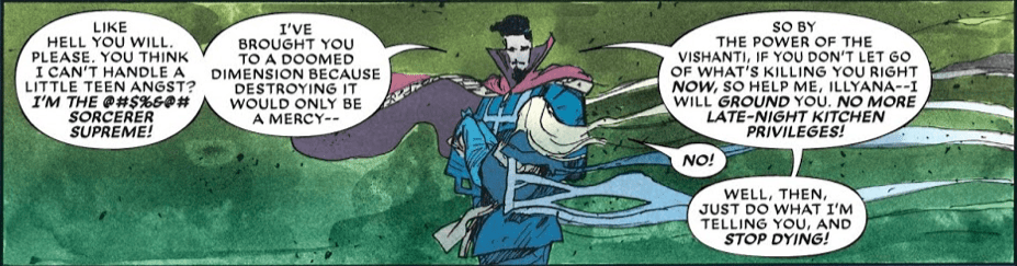By contrast, Dr. Strange attempts to teach Illyana Creation Magic, as a means to help her heal from the abuse she received. Note that Dr. Strange refers to his Sanctum Sanctorum not as a place to learn, but as a safe space. This is a story about someone who has done the unforgivable learning that there is no point of no return, no moment where they should just kill themselves. That, no matter how far gone we think we are, we can always grow into something better.