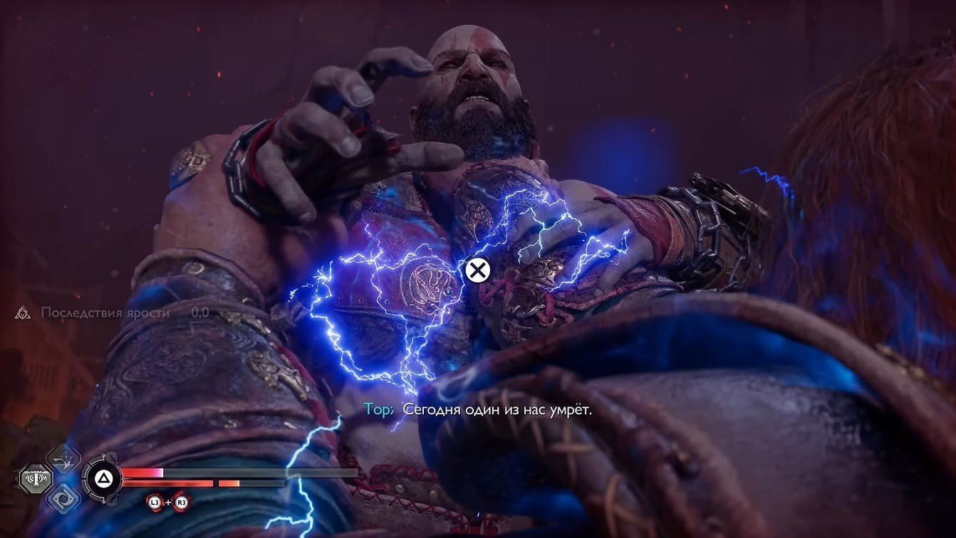 После получения урона Тор контратакует вас и кинет в стену. Запустится небольшой ролик. Атакуйте босса сразу после него. Начнется «мини-игра»: быстро жмите , чтобы схватить Мьельнир. Начнется следующая фаза.