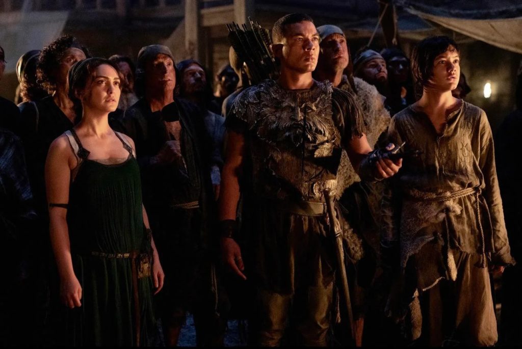 Назанин Бониади, Исмаэль Крус Кордова и Тайро Мухафидин на кадре из сериала «Властелин колец: Кольца власти» (2022)