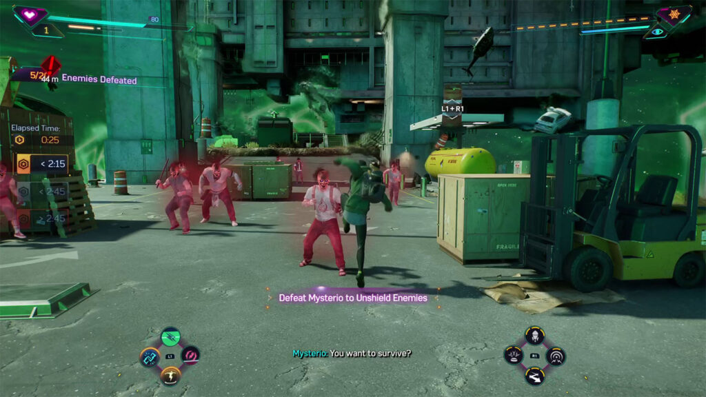 The trick to completing this challenge fast is just to focus on the fake Mysterio as soon as he pops out. Enemies will turn red once they gain a shield, and then turn back to their green color once the shield is down. Look out for the warning marker which will point at the location of the fake Mysterio once it’s out.