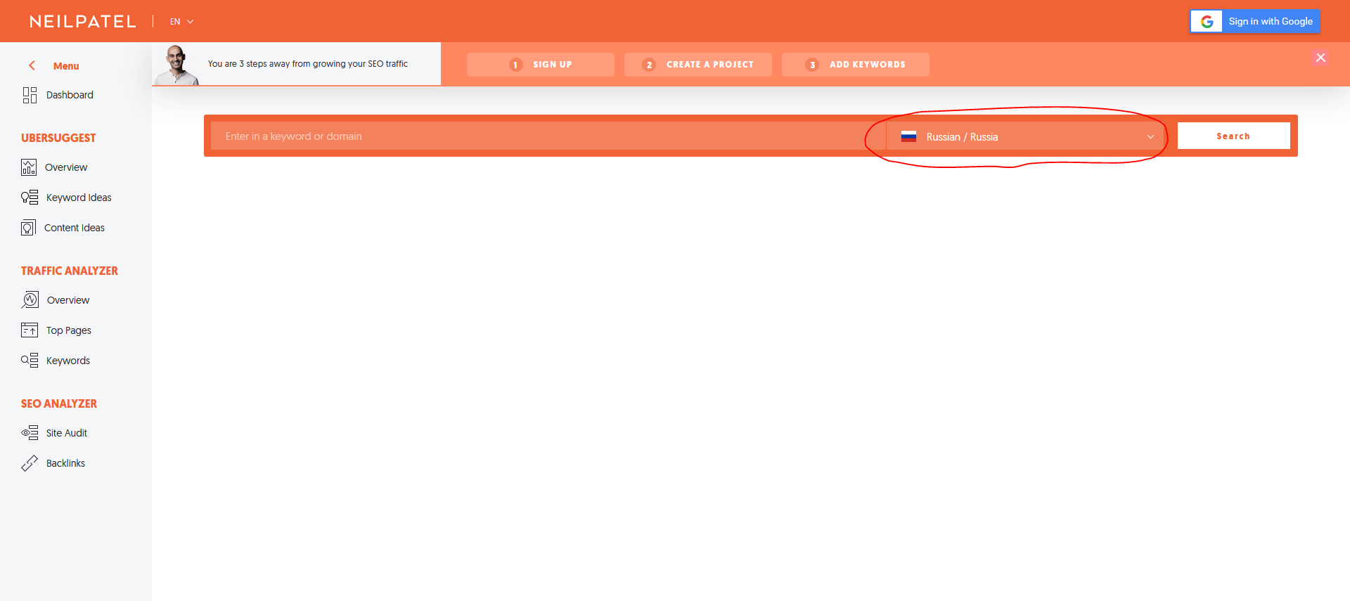 Идем дальше. UberSuggest — сервис Нила Пателя, одного из лучших копирайтеров мира. Здесь нужно первым делом указать свою страну: