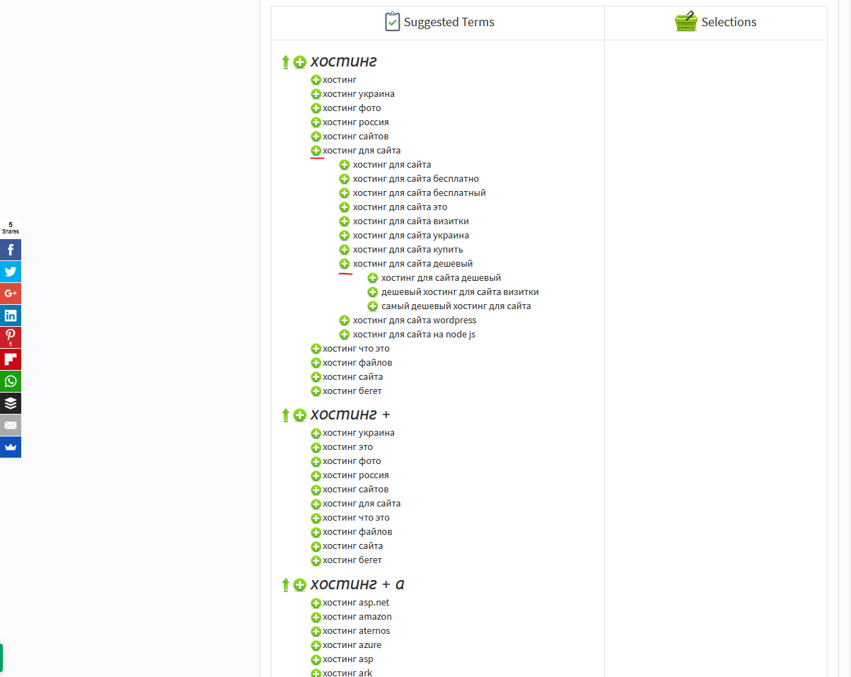 Я вбила запрос «хостинг» и выбираю, какие ключи подходят мне по тематике. Например, я не беру ключи с региональной привязанностью, потому что моя статья будет общей.