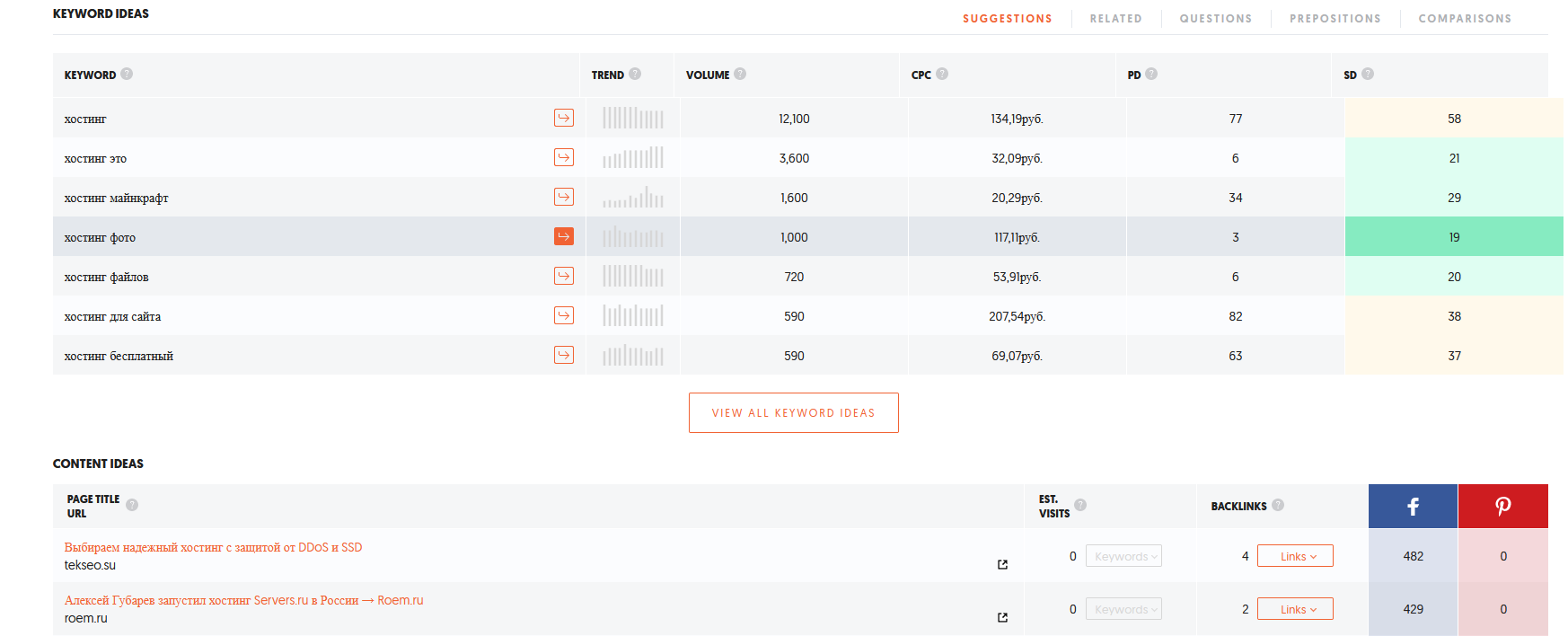 Также сервис предлагает нам «идеи контента», то есть популярные статьи, содержащие введенный вами ключевой запрос. Ссылки можно посмотреть для любого другого запроса из списка. Для этого нам нужно перейти на страницу всех ключевых запросов и кликнуть на стрелочку рядом с интересующей нас фразой.