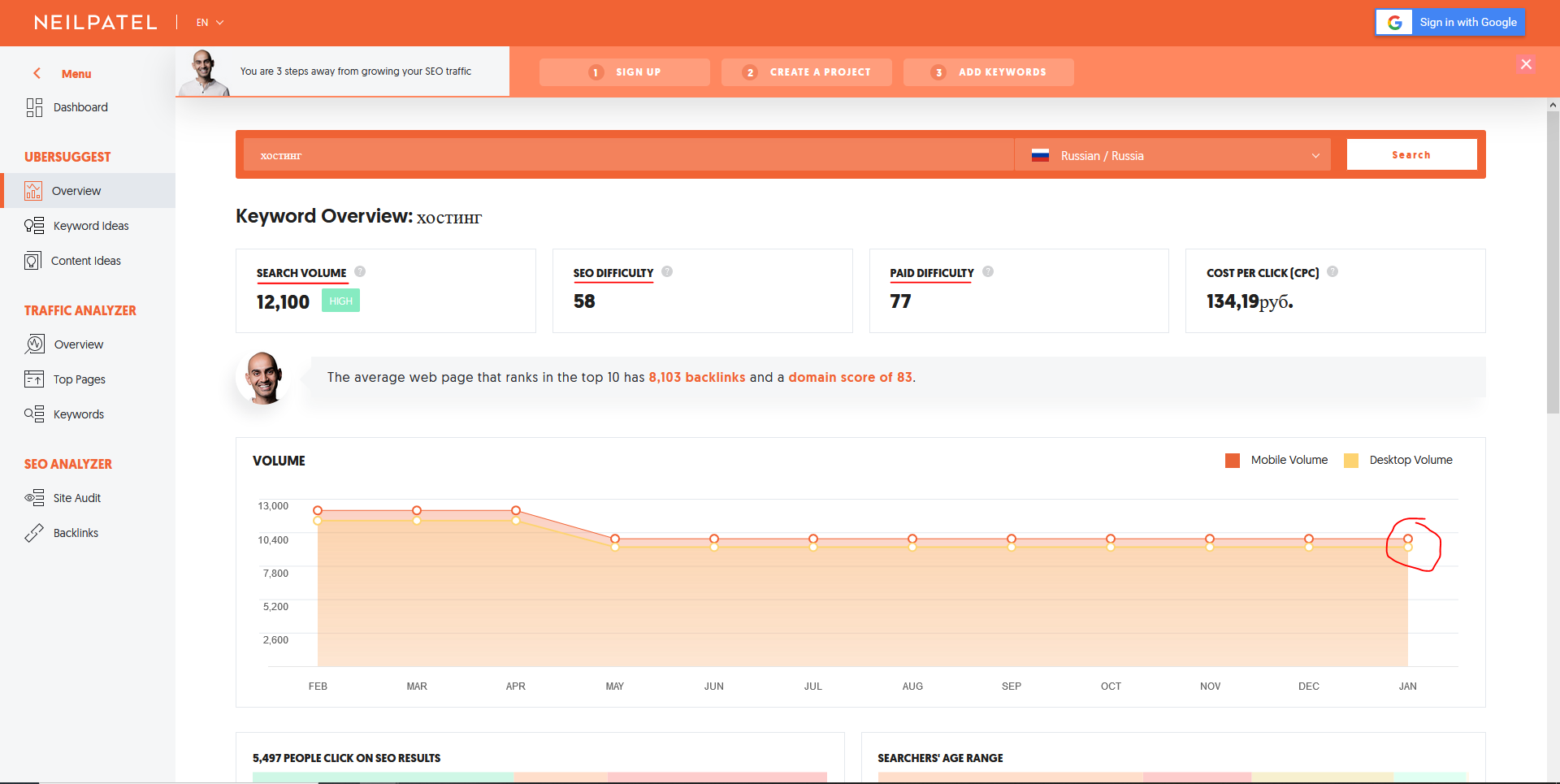 Первым пунктом идет «SEARCH VOLUME». Это количество запросов в месяц.