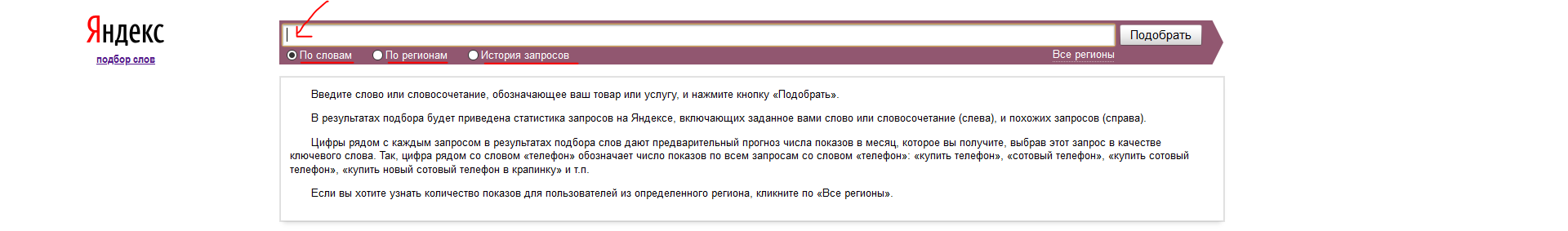 Запрос вбивается в поле, отмеченное на картинке красной стрелкой. Ниже можно выбрать тип поиска: по словам (сколько людей вводило этот запрос за последний месяц), по регионам (показы в месяц в разных регионах) или историю запроса.