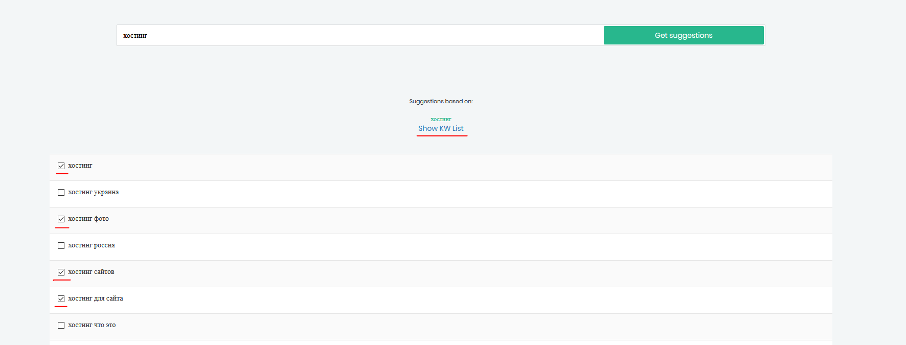 Далее я смогу выбрать нужные запросы уже из следующего списка. Фишка сервиса в том, что все выбранное будет сохраняться в «Show KW List».