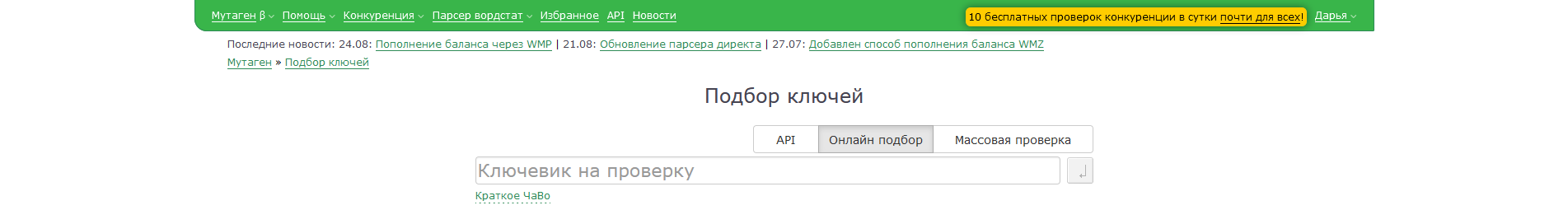 Следующий прекрасный сервис — это Мутаген. Помимо базового показа количества показов ключа в месяц, тут еще можно посмотреть уровень конкуренции по заданной фразе. А весь список собранных ключей потом экспортировать.
