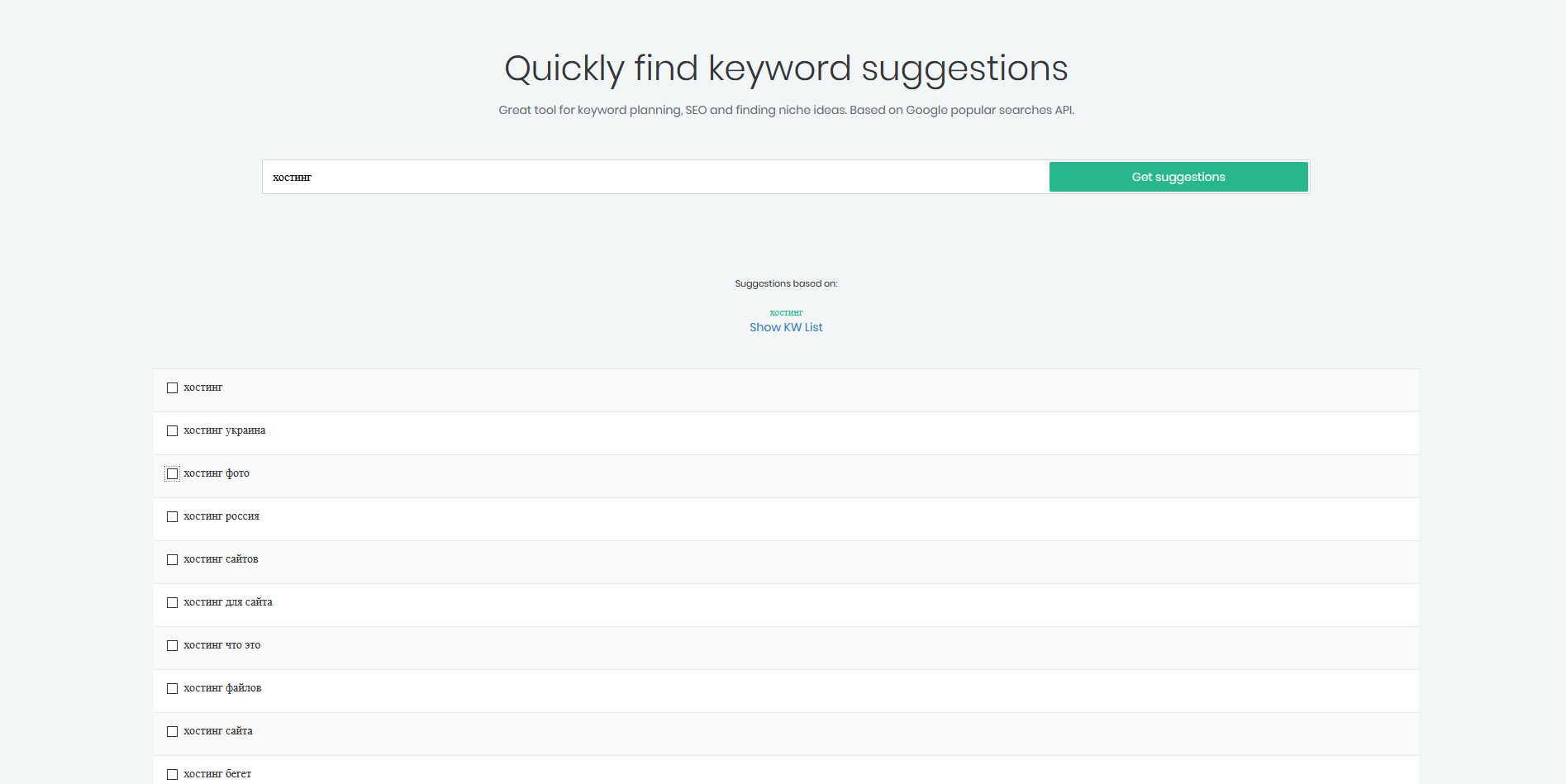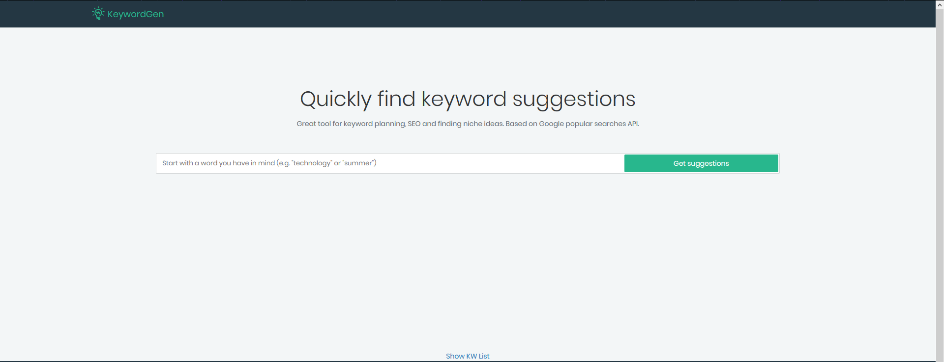 Следующий сервис — генератор ключей KeywordGen. Он на английском, но ключи на русском проверяет без проблем. Однако функционал этого инструмента менее обширный.