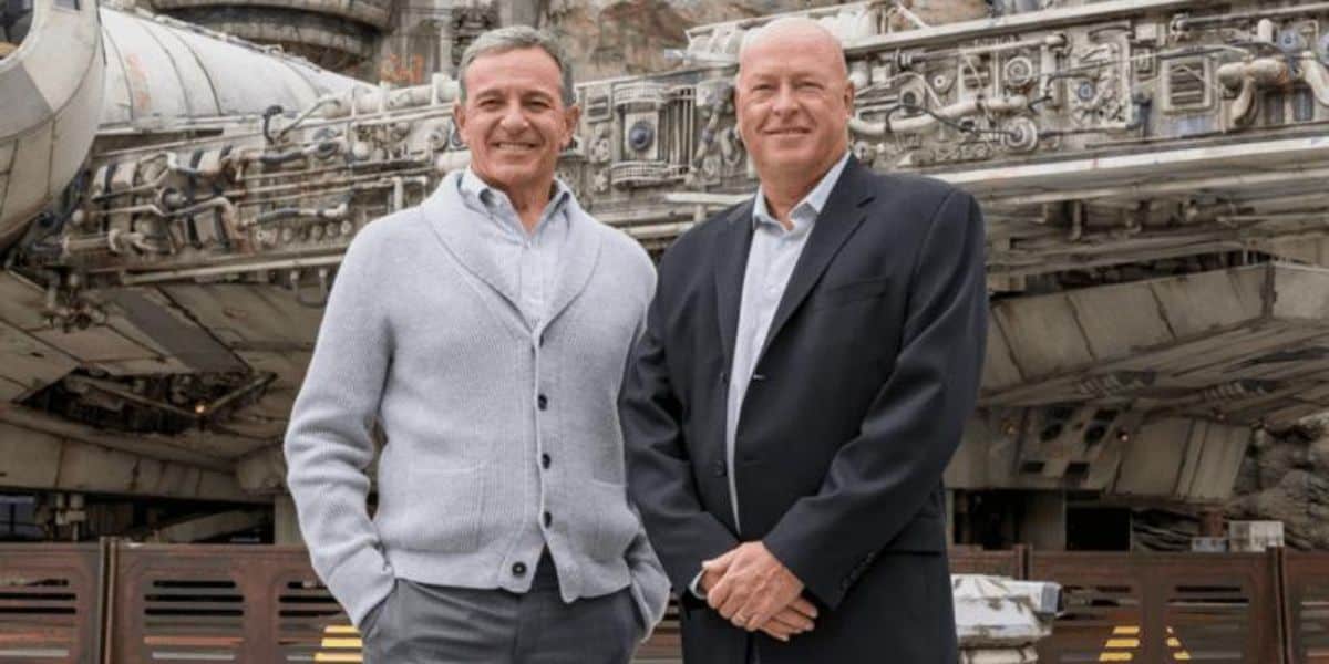 Former Disney CEO Bob Chapek and current Disney CEO Bob Iger in front of Millennium Falcon: Smuggler’s Run at Star Wars: Galaxy’s Edge in Walt Disney World /Credit: Disney