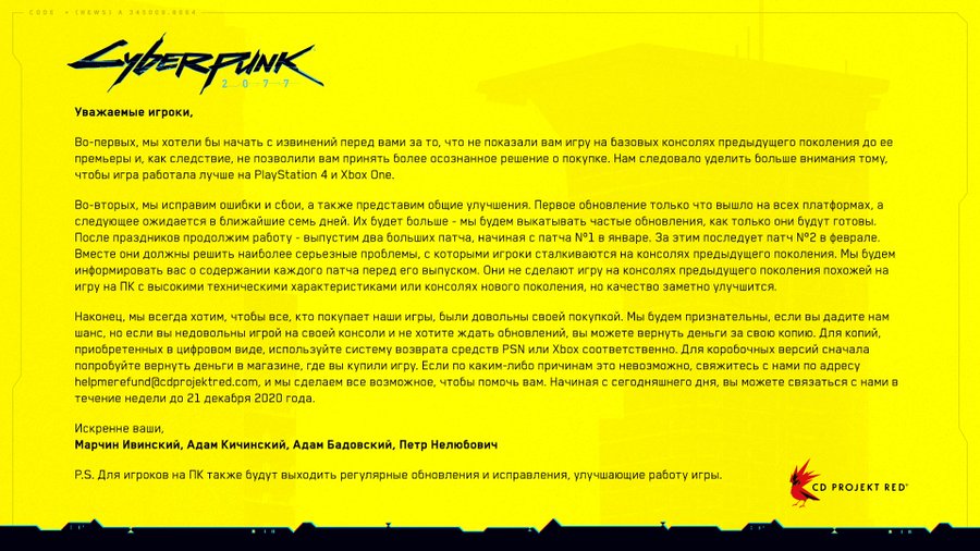 Руководители компании, которые подписали письмо, просят дать Cyberpunk 2077 шанс, но при этом, если вы не хотите делать этого, вам предлагают вернуть деньги за игру в PlayStation Network и Xbox Live. Если же у вас возникнут с этим проблемы, то вы можете написать по адресу HelpMeRefund@CDProjektRED.com, где вам постараются помочь с возвратом игры. Слать письма можно до 21 декабря.