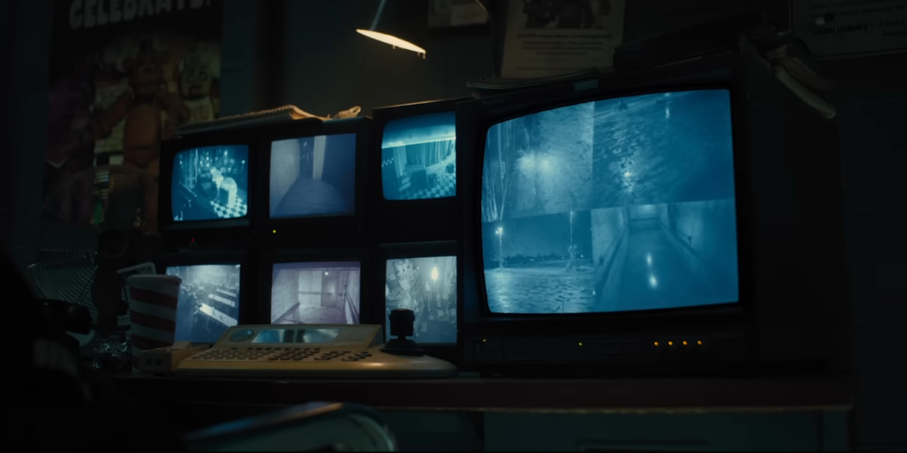 В трейлере есть известные аниматроники: Фредди, Чика и Бонни на сцене пиццерии, где и происходит сюжет фильма. Показали систему с камерами и комнату охранника, точно такую же, как в игре. А еще само здание Freddy Fazbear’s Pizza, которое выглядит заброшенным.