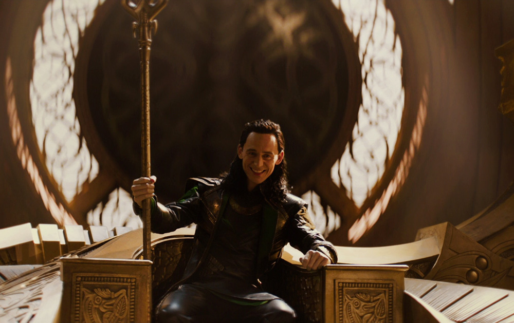 Локи на троне Одина в Асгарде, кадр из фильма «Тор 2: Царство тьмы»