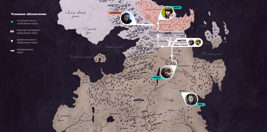 Вот в третьем варианте хочется немного по спекулировать основываясь на некоторых фактах из книг. Если посмотреть на карту, то расстояние между мельницей, где они расстались с Браном, и Последним Приютом очень небольшое. Т.е., либо они неспешно идут (что было бы понятно, если б с ними был Бран), либо попали в какую-то беду, или же Оша повела его в совершенно другом направлении. В книгах она всегда старалась избегать основных дорог, да и людей в частности. Может они и дошли до Последнего Приюта, но узнав, кто сейчас правит в нем, развернулись и ушли оттуда.
