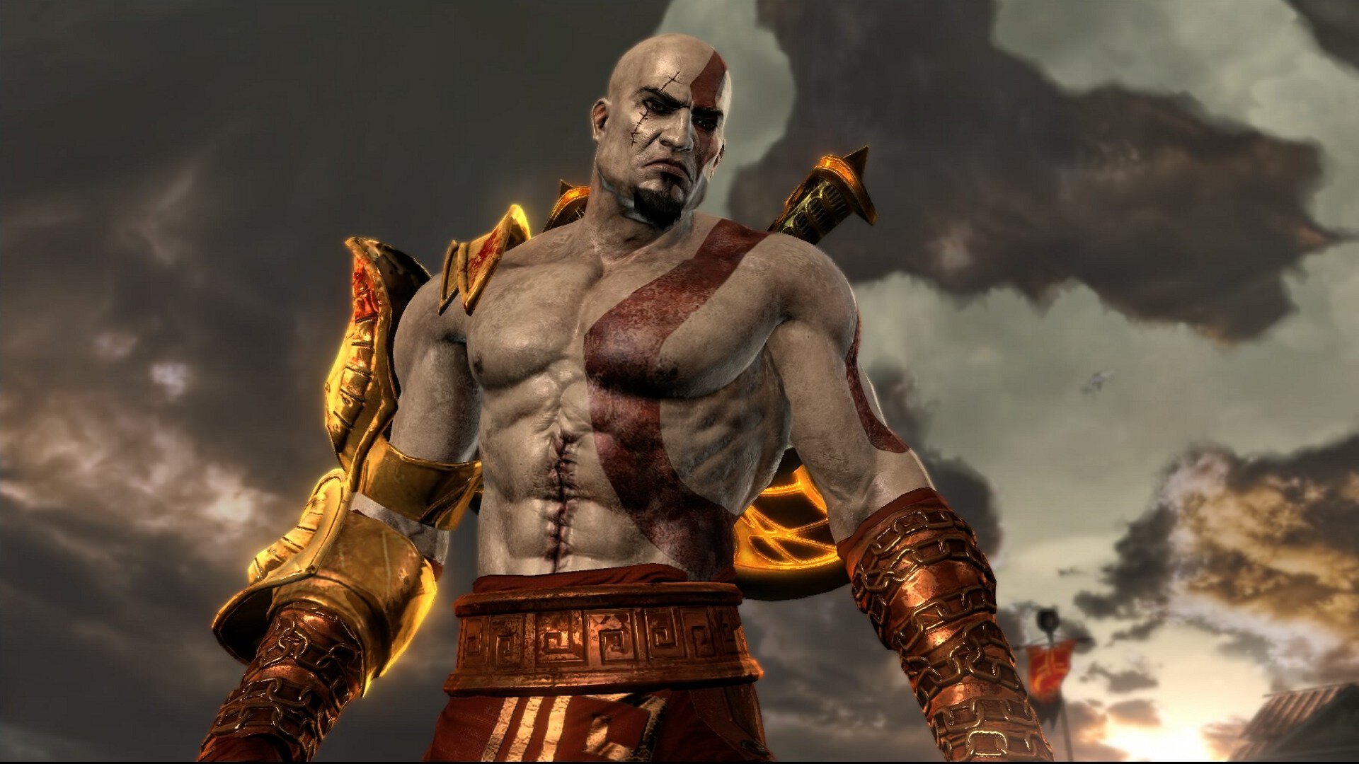 Кратос чувствует, что Афина просто желает власти. Также спартанец видит, что месть не принесла ему покой, а сделала только хуже. Тогда герой пронзает себя мечом и валится на землю. Афина уходит, а игрокам показывают кровавый след: Кратос все же выжил и куда-то уполз.
