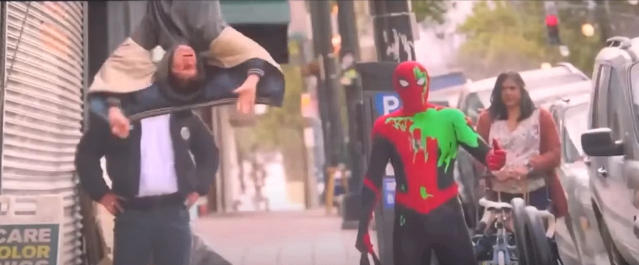 Следующая сцена, которая попала в расширенную версию представляет собой задержание грабителя Человеком-пауком, но вместо благодарности герой получает критику в свой адрес со стороны свидетелей и испорченный краской костюм. Роль грабителя в этой сцене исполнил Гарри Холланд (родной брат Тома Холланда).